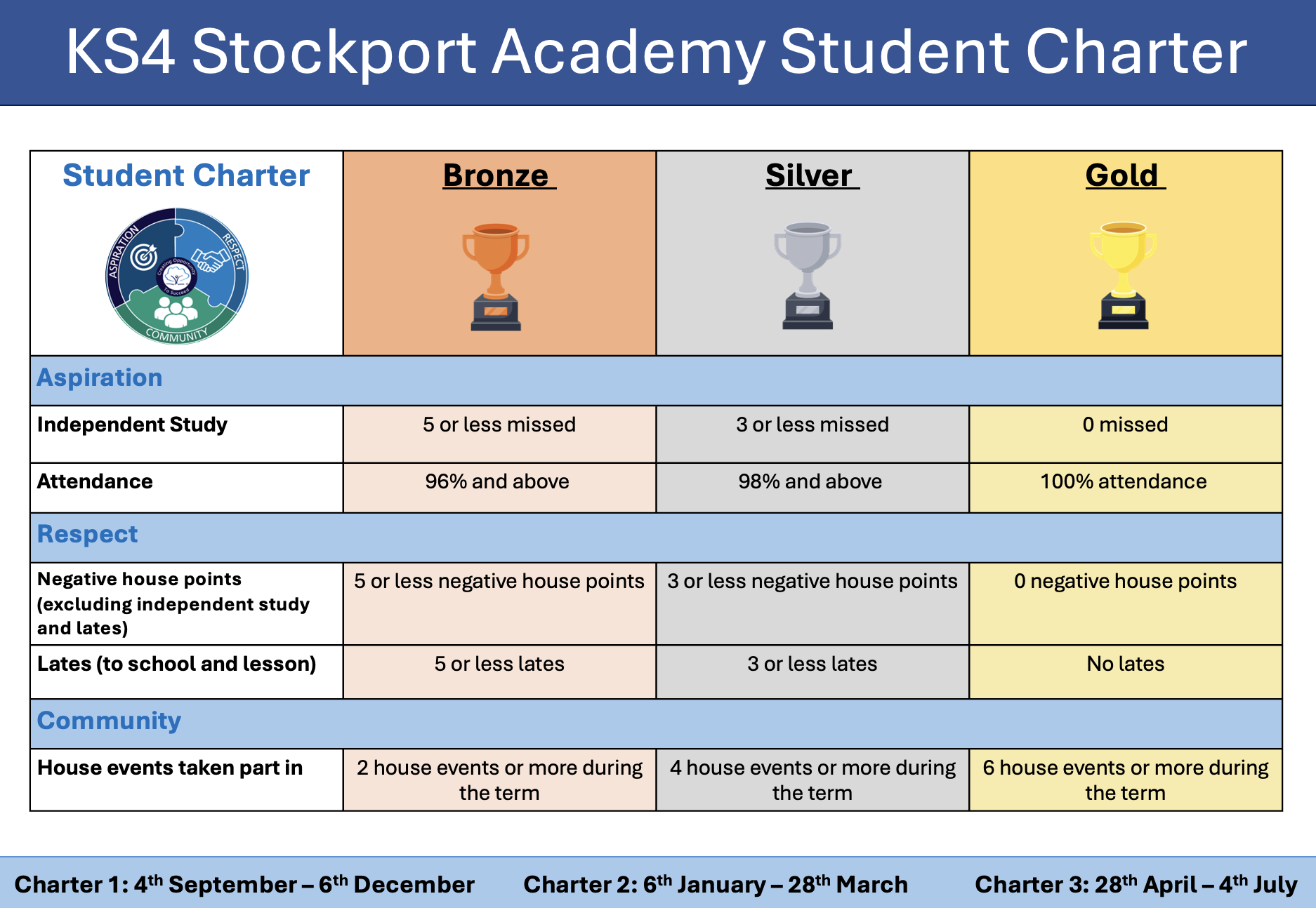 This charter runs each term and resets at the beginning of the next term. Students have 3 separate chances to meet the charter and any student who hits Gold on all three terms gains an additional 'Triple Gold' reward trip; therefore winning 4 free reward trips in total.